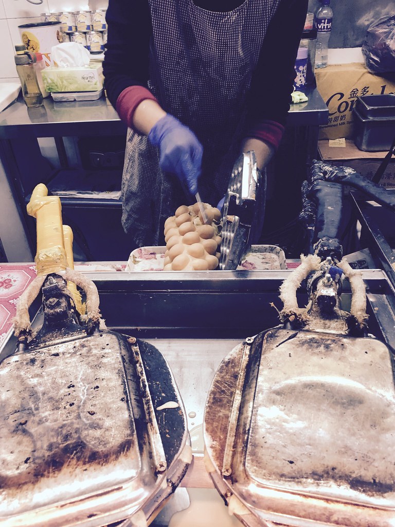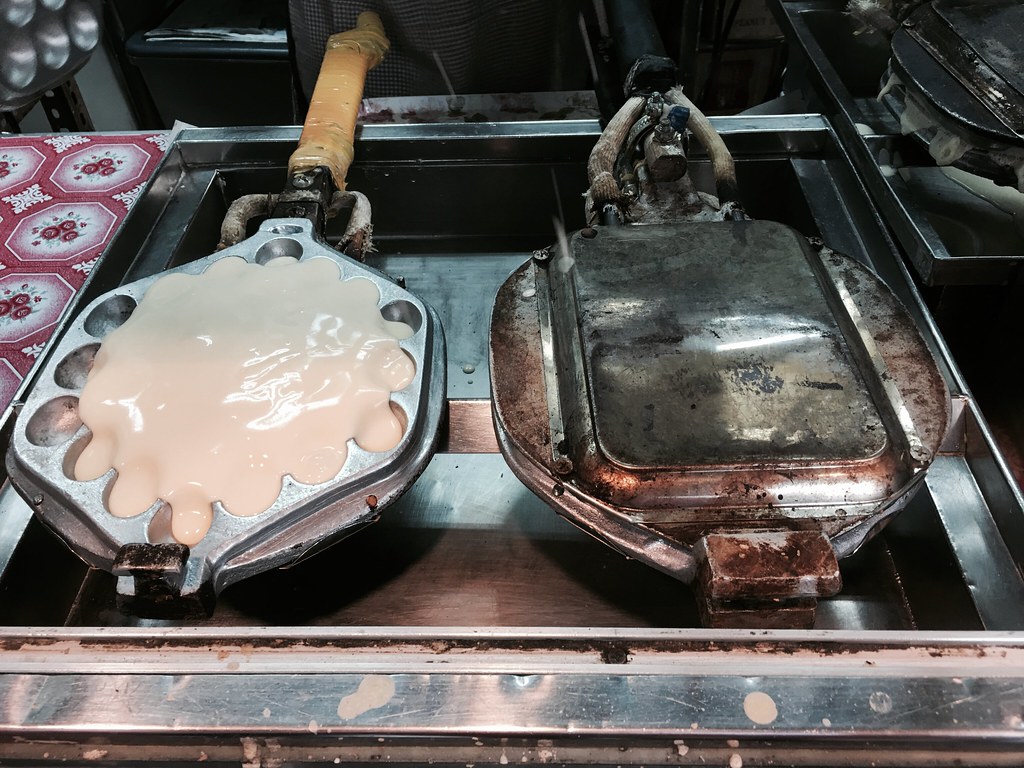好不容易終於開了,其實他是用瓦斯加熱的,且效率很高,一次弄好幾把,跟台灣的雞蛋糕比起來...其實台灣的更勝一籌說,不過因為口感不大一樣,利強記的雞蛋糕裡面會幾乎是空的,外皮是脆的,台灣大概就都是軟軟的。