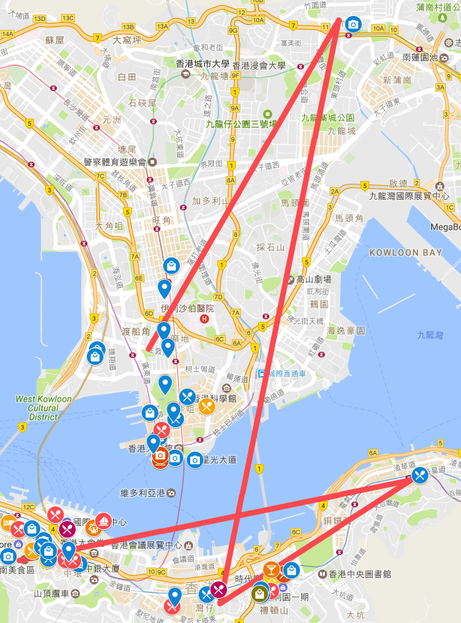重新看了一下地圖,覺得晚上從黃大仙晃完回到廟街吃夜市這樣會比較順(原本是規劃早上去黃大仙),而早上又想去吃吃北角的雞蛋糕,所以從上環-->北角-->銅鑼灣(時代廣場)-->黃大仙--->廟街--> 尖沙嘴 ---> 地鐵回住宿