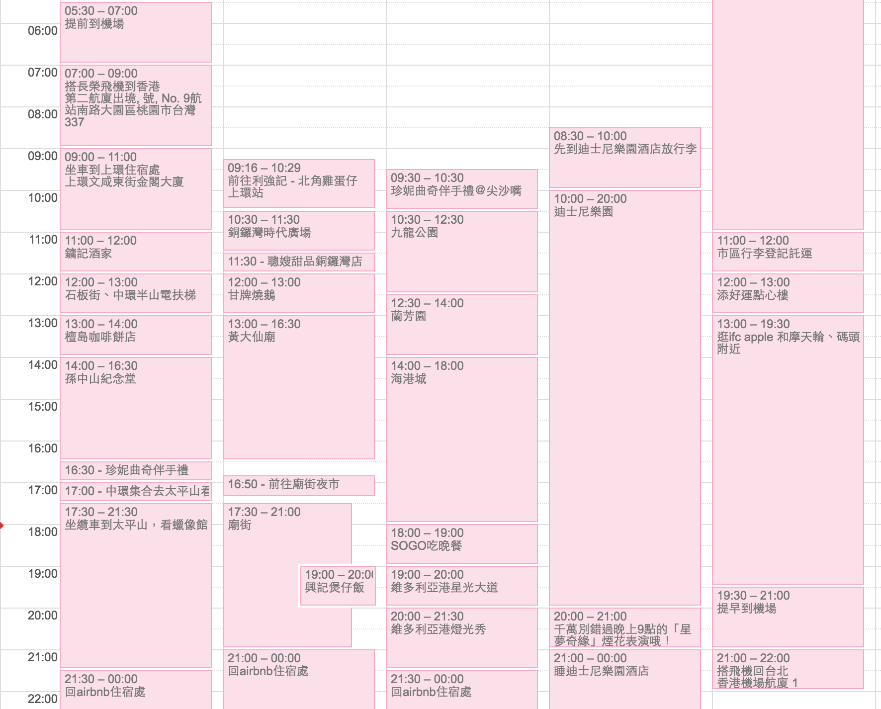 旅行最燒腦的部分莫過於安排行程了!😩 原本滿滿的購物中心行程(圓方廣場、置地廣場)都被我們毫不留情地刪掉了,畢竟海港城和IFC已經足夠讓人逛到腿軟啦!🤣 以下是我們最終的行程表: