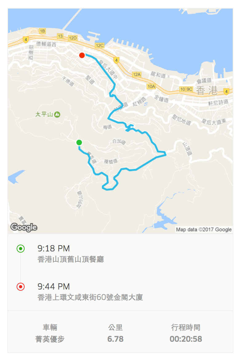 最後下山的時候其實包套是有附下山的纜車,但下山人群大概是上山的兩倍,且沒有插隊優惠,加上天氣又冷,還是叫了Uber回上環,其實不貴。 大概就是港幣64塊。